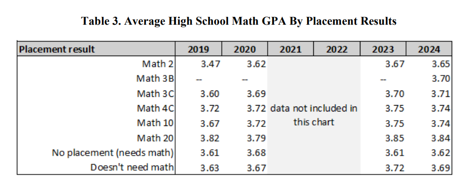 More importantly, having recognized the magnitude and severity of the problem, what are they going to do about it? Remember, they cannot use standardized test scores in their admission process. Briefly: they recommend using a new model they invent called the Math Placement Outcome (MPO), which looks at applicants’ math grades and makes various adjustments for the student’s school. The big issue with this idea, which they do note, to their credit, is that a relatively meager difference in math grades separates students who can’t do algebra versus those headed straight into calculus. Specifically, 3.65 v. 3.84.