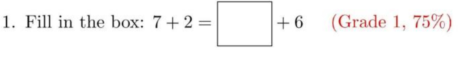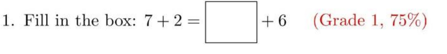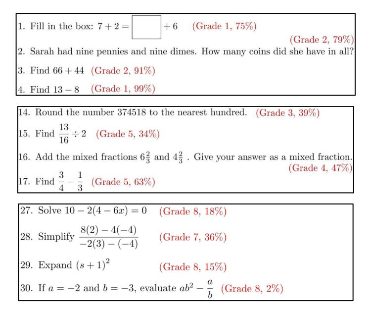 What kind of gaps? Here are sample questions from a test prepared by the math department to assess the skills of these remedial students, each labeled by the grade level of the skill and the percentage of such students who got it correct.
