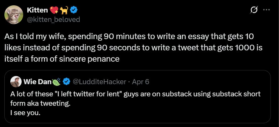 Yes, part of this is that I have 20k followers on twitter and only a couple hundred here. But even controlling for that obvious factor, there’s really no comparison between the two platforms in terms of the dopamine delivery relative to the effort it takes. The tweet above is actually exaggerated in both directions: 90 minutes is fast for an essay and 90 seconds is slow for a tweet. This one took me no more than 20 seconds and it got me 20k likes.