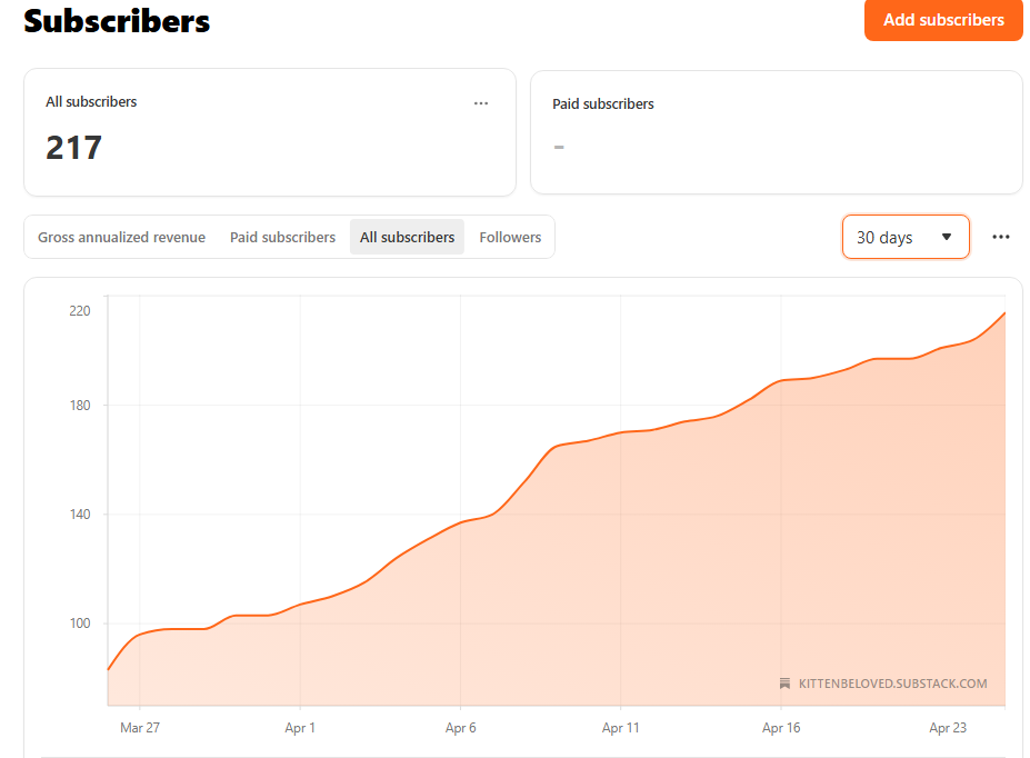 Meanwhile it seems very rare on substack for anyone without a substantial real-world following to have amassed even a few hundred subscribers, free or otherwise. I don’t think this is because it’s especially challenging to grow a readership here assuming some level of talent and work ethic, I think its because so few people are trying. I don’t claim to be a brilliant generational essayist, and here’s my growth from writing just nine essays: