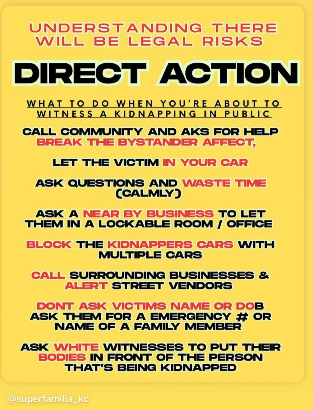 The group also shared the following flyer on Instagram, encouraging its membership to interfere with ICE operations by “block[ing] the kidnappers cars with multiple cars” and “ask[ing] white witnesses to put their bodies” in the way of officers. If this advice sounds familiar, it should.