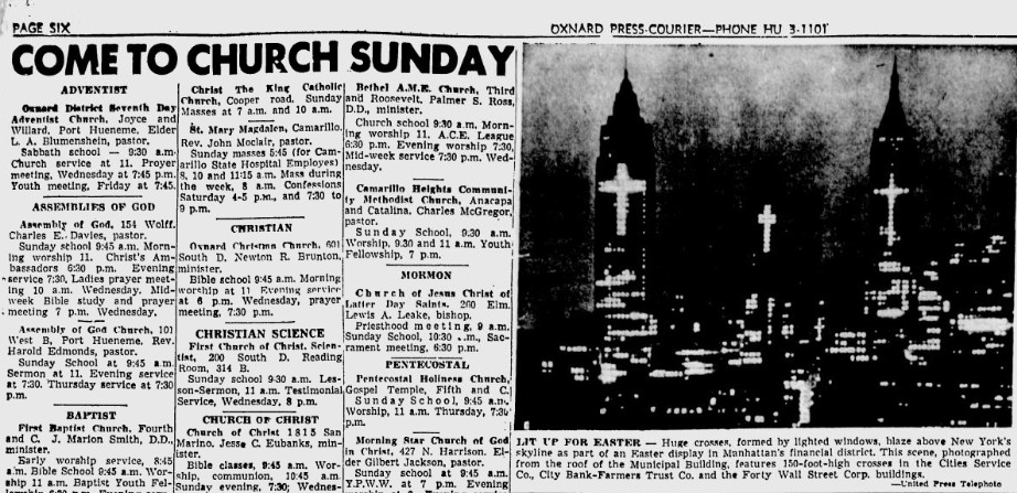 Strangely enough, the same generation that ushered in this secularization of Christmas in popular culture themselves grew up in a culture awash in explicitly religious pageantry around the Christian holidays, and around Christmas in particular. Religion played so large a role in their day-to-day lives that most of their grandchildren would find it off-putting. They prayed in public school and read the Bible there, as well as at home. Their town hall probably had a large, publicly funded nativity scene. Their community life was organized around church membership and attendance. And unlike today, no one was particularly furtive about proclaiming their faith to the world in a professional context, as in this now-famous photo of Manhattan skyscrapers turned into giant crosses for Easter.