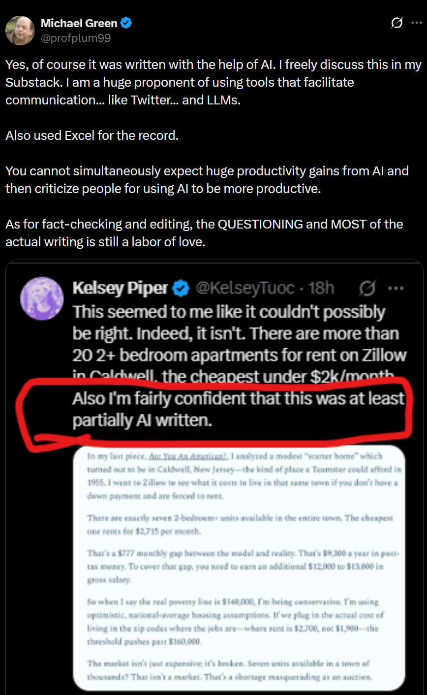 Last week a finance guy went viral for making the risible claim that a household income of $140,000 is the minimum to not live in poverty. There was lots of incisive criticism of this claim, but what I found most astounding was the author’s response to an accusation that AI wrote his article. Yes it did, he responded, and I’m proud of it.
